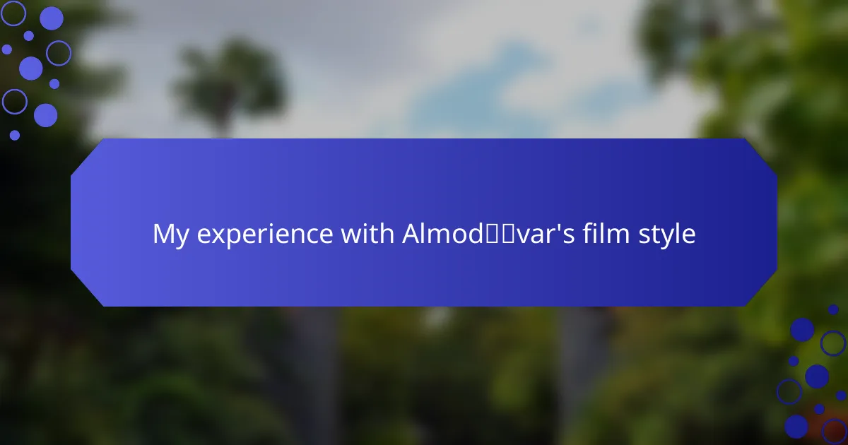 Almodóvar’s film style caught me off guard the first time I watched one of his movies. His use of vibrant, almost exaggerated colors isn’t just for show—it feels like they breathe life into every scene, making emotions pop off the screen. Have you noticed how his characters often exist on the edge of chaos and tenderness? That contrast made me rethink what storytelling could be.